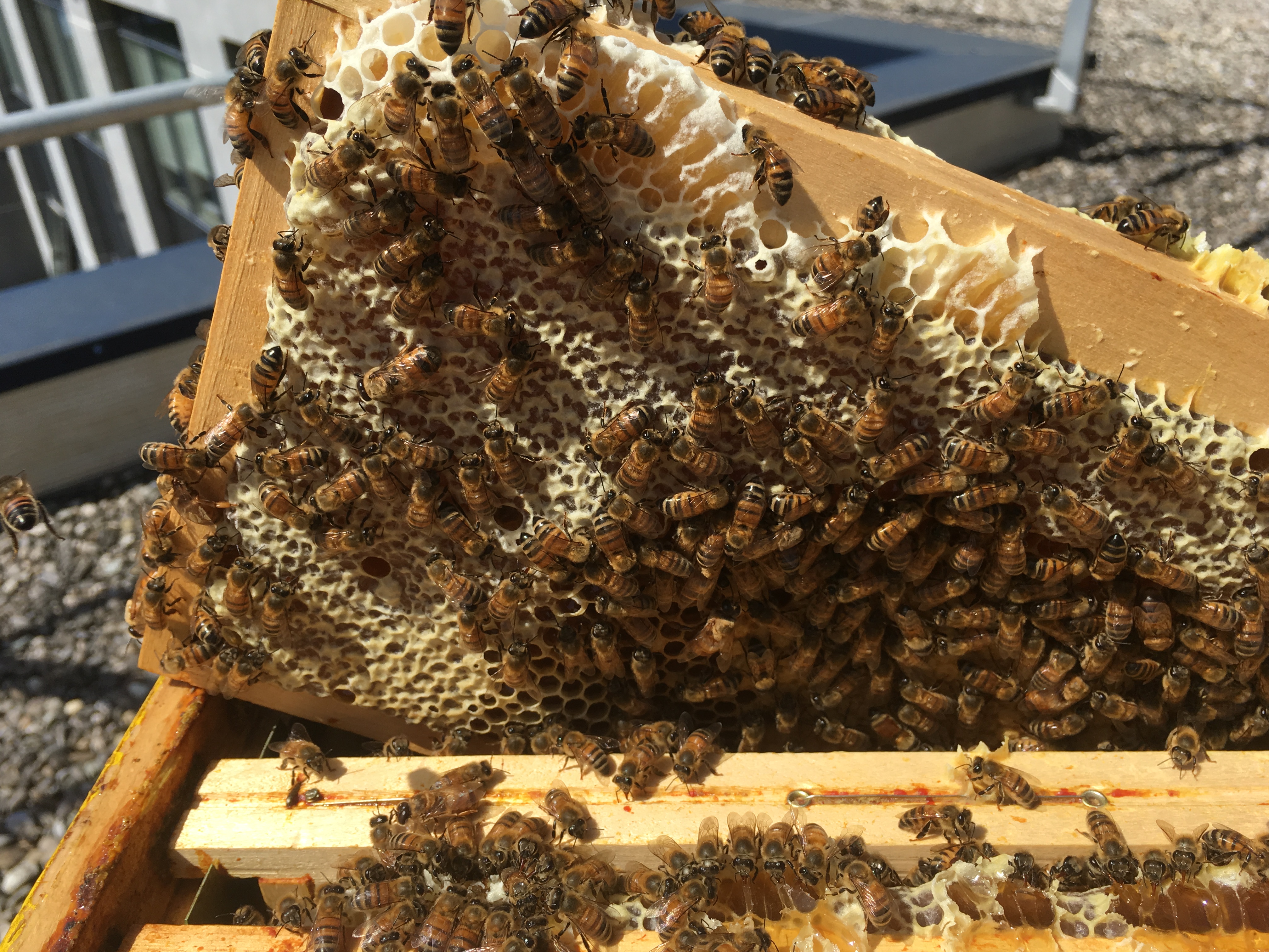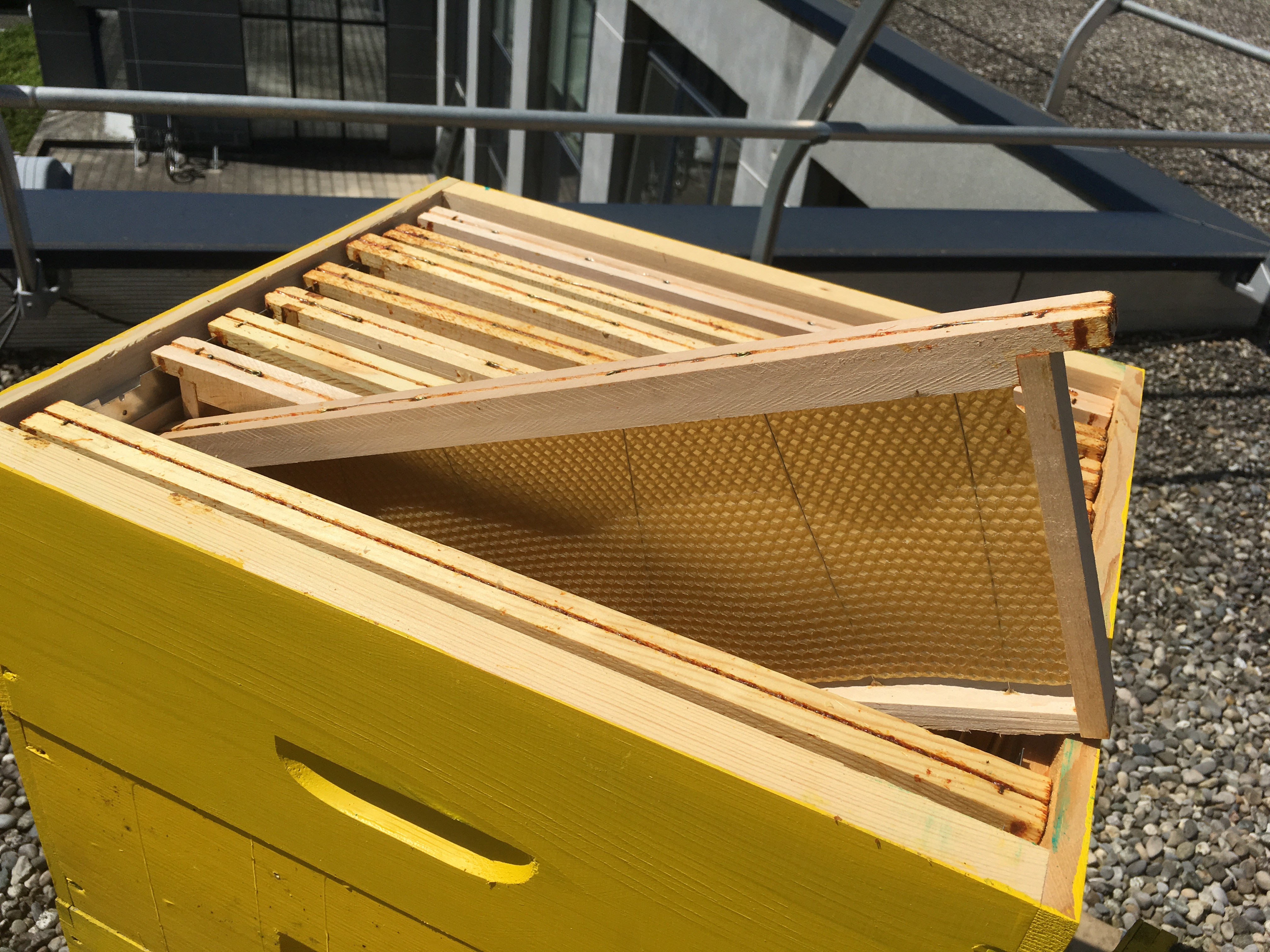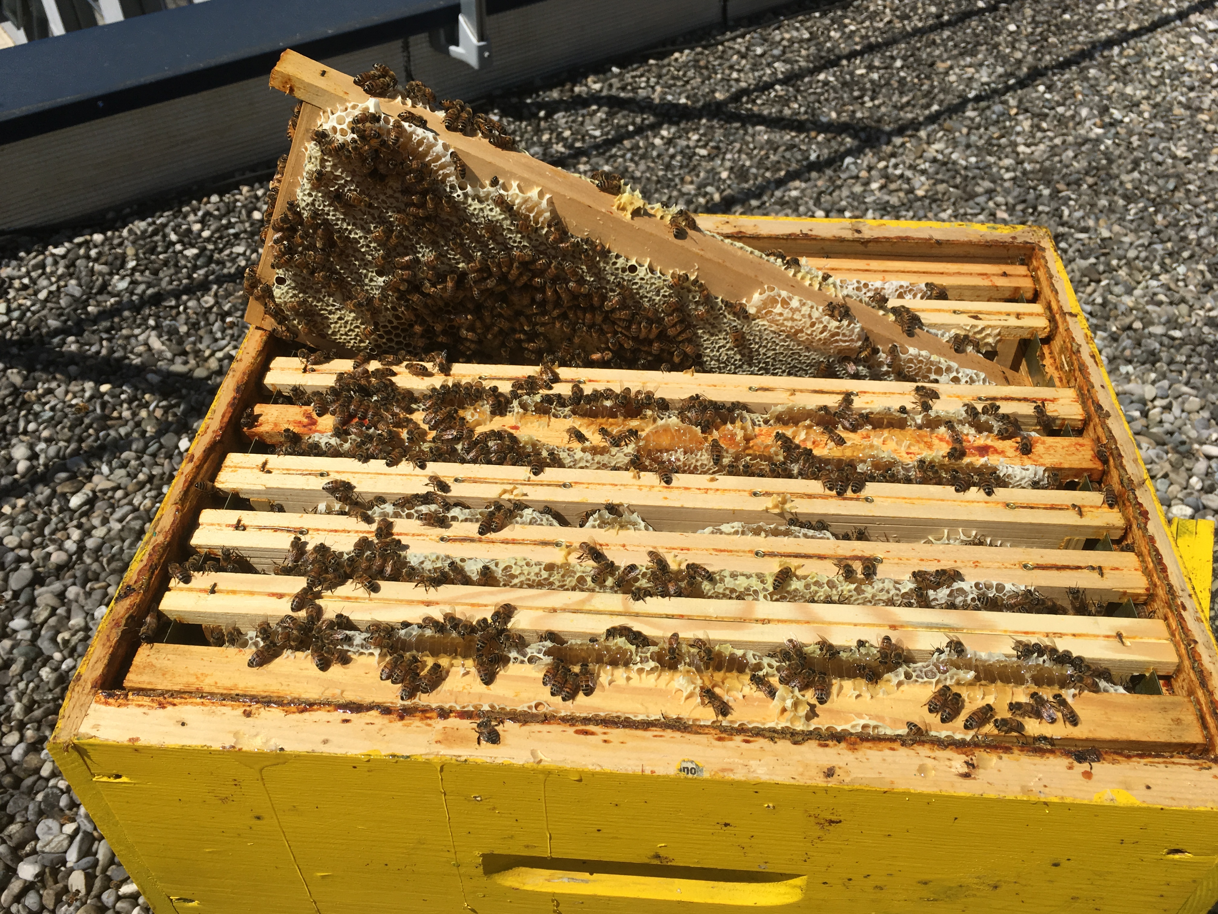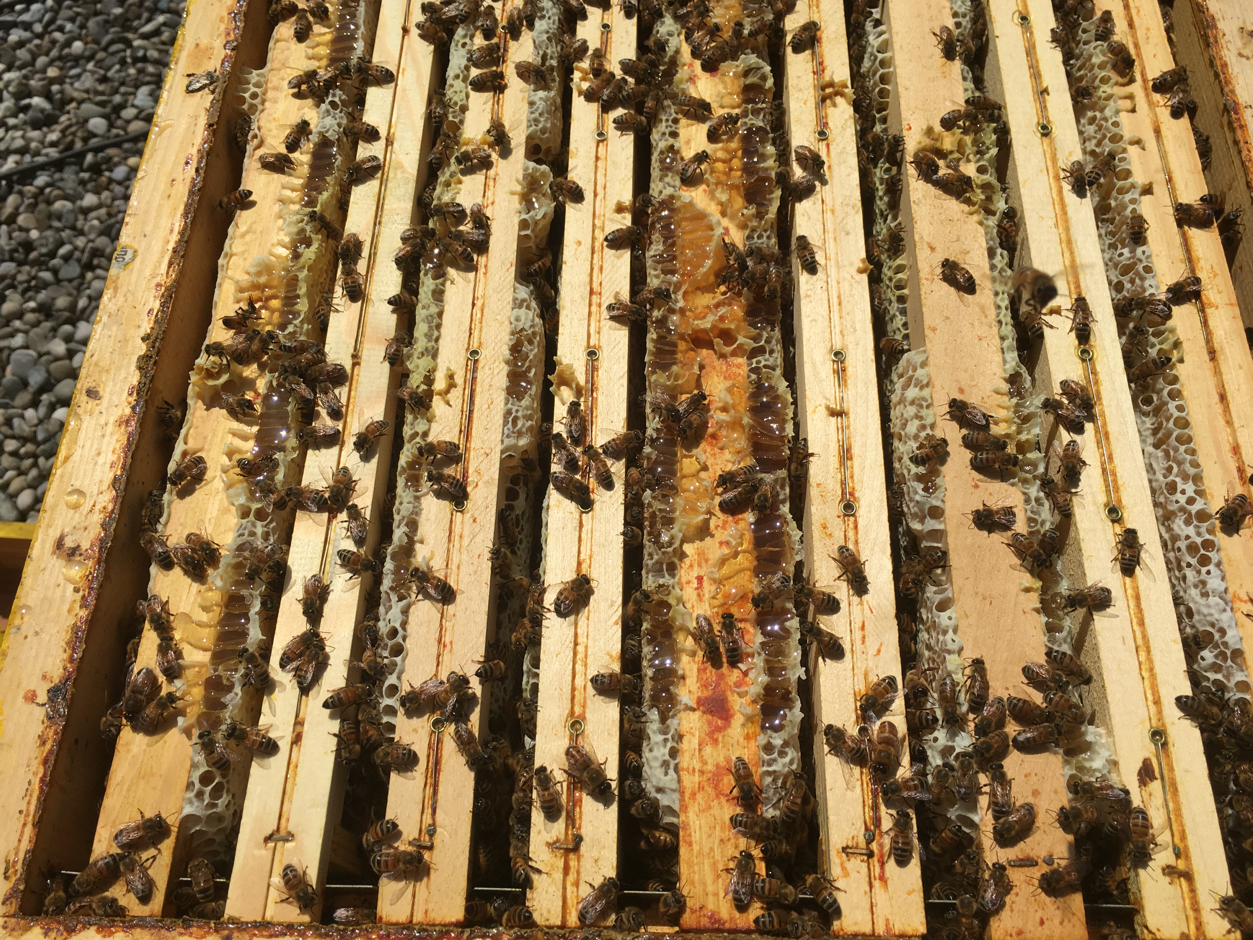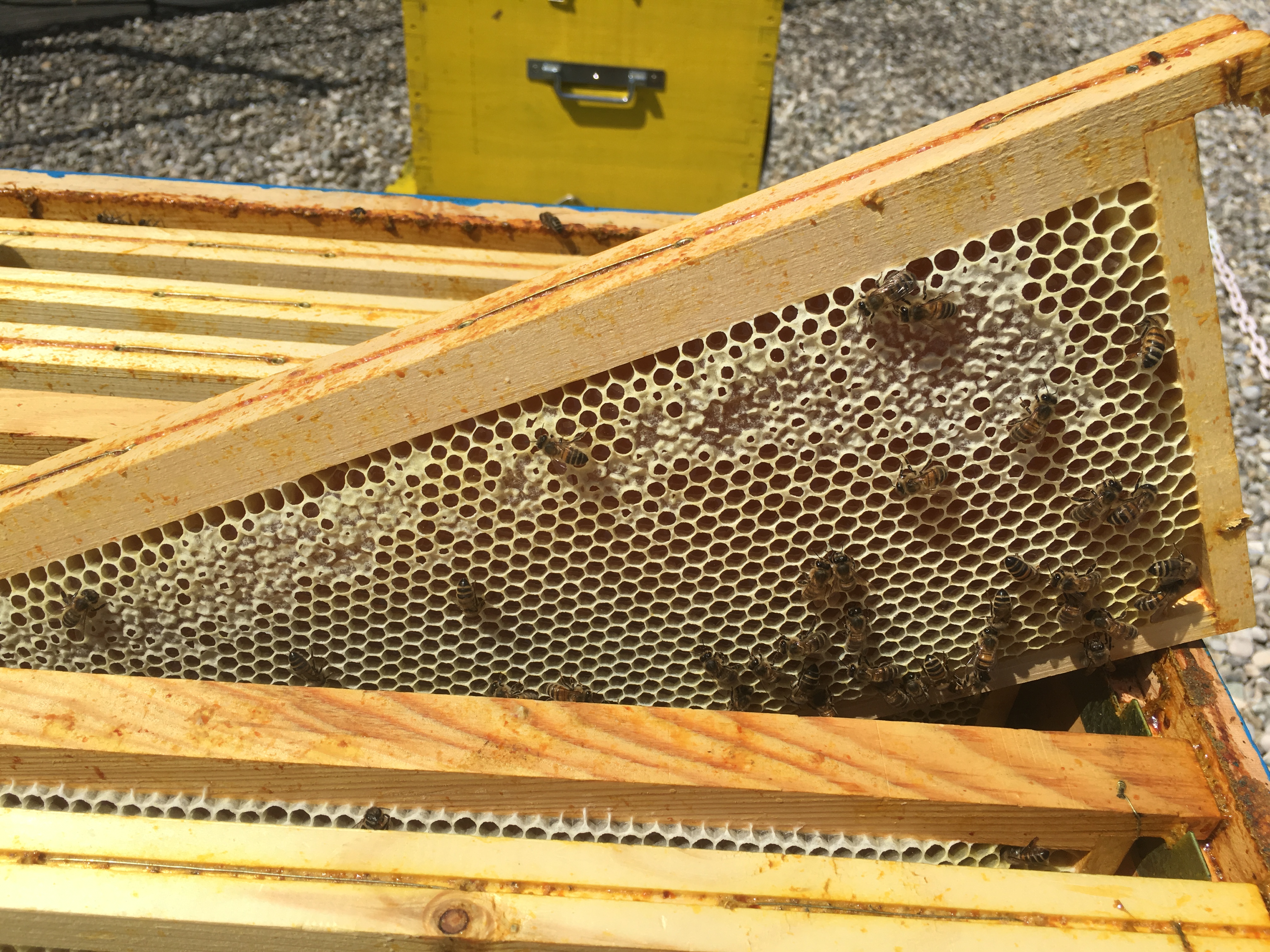 Le beau temps de ce début avril, qui fait suite à une longue période d’intempéries, a libéré les abeilles ! La végétation a démarré d’un coup procurant ainsi du nectar et du pollen en abondance pour les butineuses qui s’en sont donné à cœur joie. Près de 20 kg de miel déjà emmagasiné par ruche au 25 avril et donc l’obligation de mettre une 2ème hausse pour que les abeilles puissent continuer leur travail.